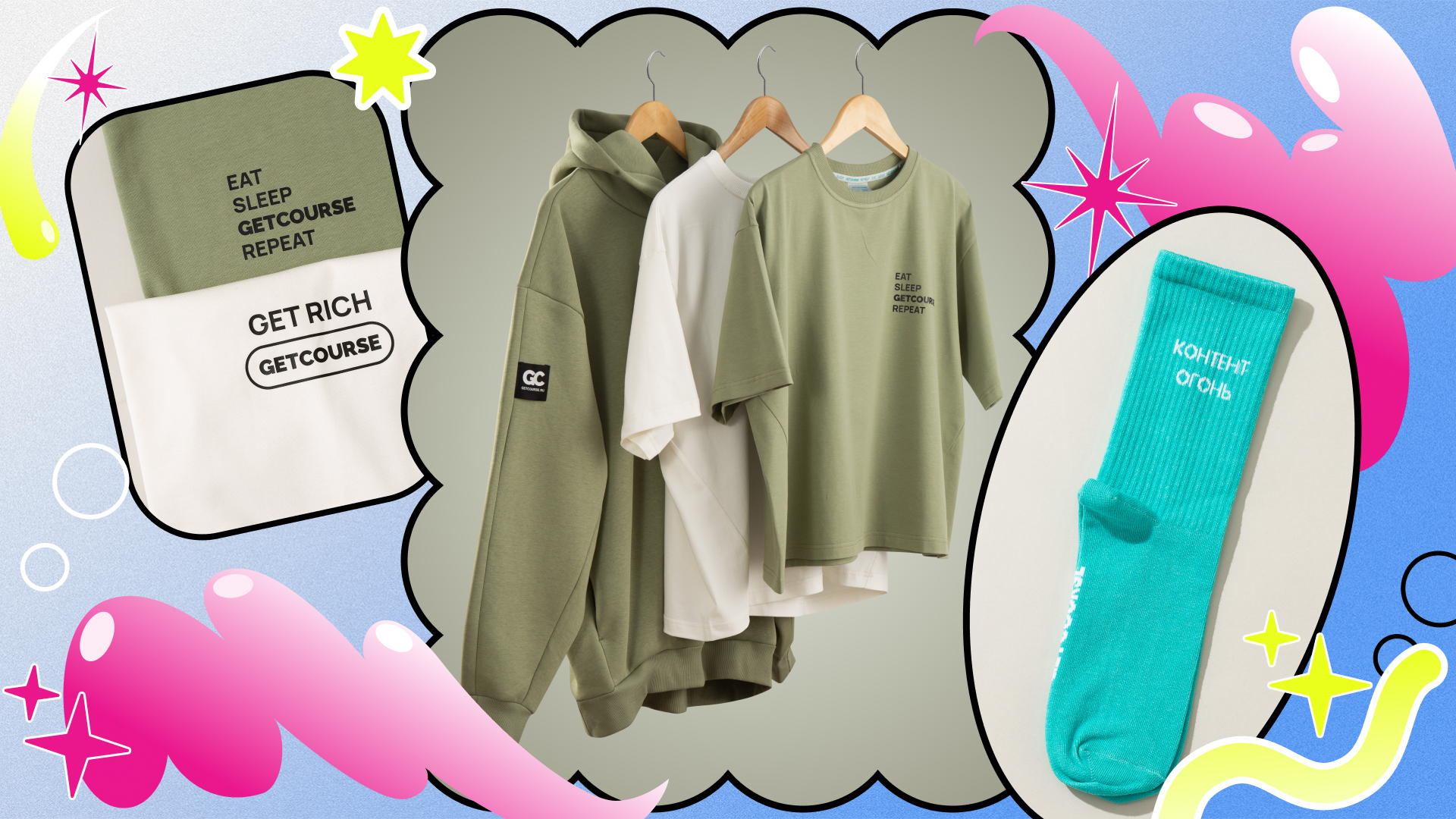 Базовый мерч для образовательной платформы GetCourse. Логотип размещен на бирке на рукаве худи и аккуратно вписан в мемные слоганы на футболках. Царство минимализма: деликатный черный шрифт, неброский оливковый и базовый белый цвета — для комфортного добавления вещей в повседневный гардероб. За рамками посыла только яркие (умышленно) носки — на них размещен важный локальный мем.
