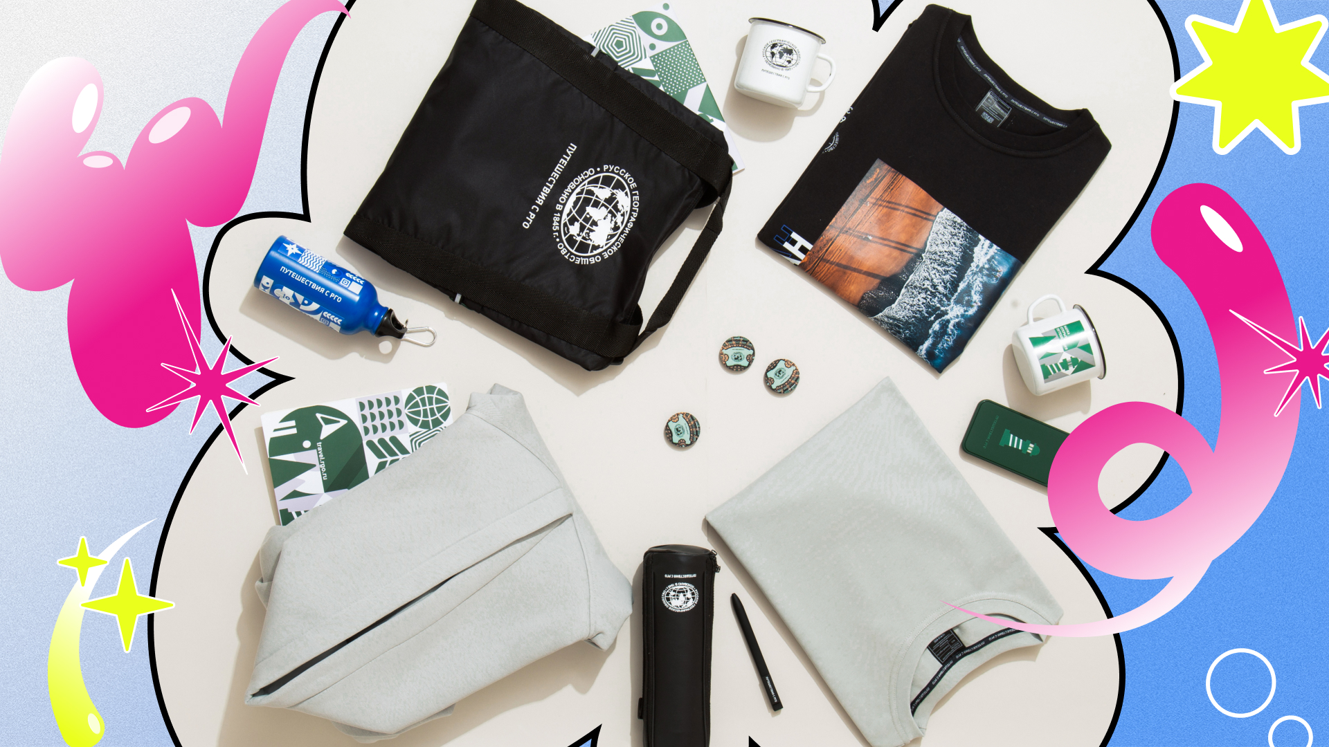 Набор для любителей путешествий и поклонников «Русского географического общества». Все вещи со смыслом — с духом открытий и походов: термос в чехле, эмалированная походная кружка, музыкальная колонка с фонариком, теплое худи, две комфортные футболки оверсайз, вместительный рюкзак-шопер (чтобы носить его как удобно). Логотип здесь заметен и уместен, поскольку мерч создан для поклонников сообщества, а также плавно дополняет использованные в дизайне фотографии.