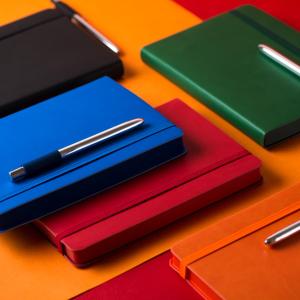 Универсальный деловой сет для партнеров, сотрудников или клиентов. Ежедневник с гибкой обложкой, аккумулятор с индикатором заряда и стильный вечный карандаш.