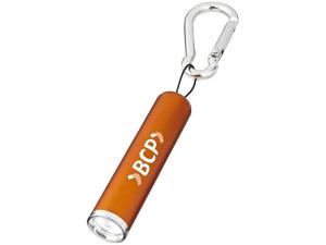 Фонарик с карабином Ostra. Одинарный яркий диодный фонарик с двигающейся кнопкой вкл/выкл в анодированном корпусе. В комплекте батарейки, карабин не предназначен для скалолазания. Алюминий.