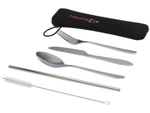 Набор столовых приборов "Sheen" включает вилку, нож, ложку, многоразовую соломинку и щёточку для её очистки. Все элементы выполнены из прочной и легко моющейся нержавеющей стали. Комплект удобно хранить и переносить в прочном чехле из неопрена с удобной петлей.