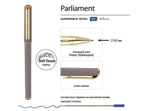 Ручка "Parliament" с чернилами на масляной основе синего цвета отличается мягким письмом и толщиной линии 0,5 мм. Ее прорезиненный корпус soft-touch обеспечивает комфорт при длительном использовании, а отвинчивающийся наконечник облегчает доступ к сменному стержню. Колпачок с клип-зажимом обеспечивает удобное крепление ручки на одежде или сумке. Качество письма обеспечивается премиальным швейцарским пишущим узлом диаметром 0,7 мм от производителя Premec и немецкими чернилами марки Dokumental. Ручка упакована в индивидуальную подарочную упаковку.
