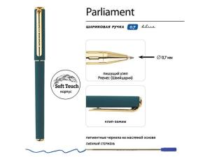 Ручка "Parliament" с чернилами на масляной основе синего цвета отличается мягким письмом и толщиной линии 0,5 мм. Ее прорезиненный корпус soft-touch обеспечивает комфорт при длительном использовании, а отвинчивающийся наконечник облегчает доступ к сменному стержню. Колпачок с клип-зажимом обеспечивает удобное крепление ручки на одежде или сумке. Качество письма обеспечивается премиальным швейцарским пишущим узлом диаметром 0,7 мм от производителя Premec и немецкими чернилами марки Dokumental. Ручка упакована в индивидуальную подарочную упаковку.