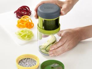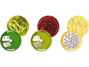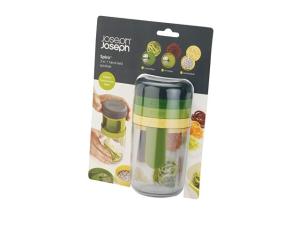 Спиральная терка открывает новые возможности для тех, кто любит готовить. Легкая в использовании конструкция делает длинные ровные полосы из овощей и фруктов. Полученная овощная «лапша» подходит для украшения праздничных блюд, а также для приготовления различных салатов. В комплект входит крупное и среднее лезвие, насадка для сыра и небольшой контейнер для хранения тертых овощей и фруктов. Все элементы соединяются в одном контейнере и занимают минимум места в ящике стола. Можно мыть в верхней части посудомоечной машины.