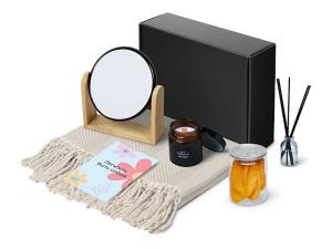 Материал товара: плед - 100% хлопок, свеча - стекло, мешок - нетканый материал (спанбонд), коробка - картон, зеркало - бамбук, пластик, стекло, манго -пластик, диффузор - стекло