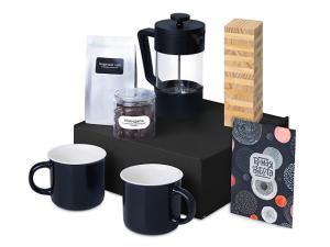 Материал товара: кружка - костяной фарфор, френч-пресс - боросиликатное стекло, нержавеющая сталь, пластик, чай - пластик, игра - сосна, миндаль - пластик, мешок - нетканый материал (спанбонд), коробка - картон