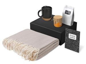 Материал товара: плед - 100% хлопок, кружка - керамика, пробка, чай -пластик, мешок - нектаный материал (спанбонд), коробка -картон