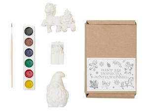 Набор для творчества «Winter Whinnies» станет прекрасным подарком в год Лошади и позволит приятно провести время на каникулах всей семье. В набор входят три гипсовых фигурки — лошадка елочкой, гном подарочная коробка с пряничными человечками, а также акварельные краски и кисть. Игрушки можно покрывать краской в несколько слоев, чтобы дополнить дизайн яркими деталями. Акварельная краска легко смывается теплой водой, поэтому игрушки можно неоднократно раскрашивать – достаточно смыть краски и дать изделиям высохнуть. • Символ года Лошади • Интересное занятие для детей и взрослых • Можно раскрашивать много раз