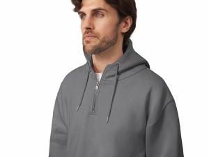 Худи с капюшоном ворот на молнии. Шнур в капюшоне с металлическими наконечниками. Отделка горловины спинки внутри тесьмой, Риб 2х2 по низу изделия и манжетам. Удобный карман кенгуру.
