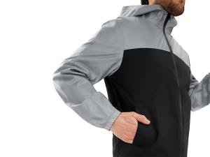 Streetwear-ветровка с контрастным дизайном: верх переда и спинки, рукава и капюшон — из светоотражающей ткани, низ — из прочной чёрной полиэстеровой ткани. Модель на подкладке, со спинкой длиннее переда. Детали: водонепроницаемая молния, боковые наклонные карманы с листочкой, манжеты на резинке, удобный капюшон, кулиска по низу. • Заметность в темноте — светоотражающая верхняя часть повышает безопасность. • Защита от ветра и дождя — влагостойкая молния и плотная ткань. • Комфортная посадка — удлинённая спинка и подкладка для межсезонья. • Универсальный городской стиль — легко сочетается с повседневным гардеробом.