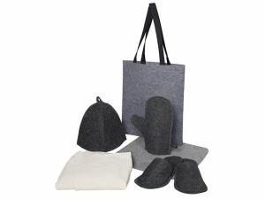 Женский банный набор "Healing" для комфортного отдыха: лежак для бани, холщовый килт-парео, рукавица, шапка и тапочки — всё аккуратно упаковано в стильный фетровый шоппер.