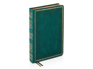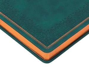 Недатированный ежедневник "Royal" формата А5 с твердой обложкой из искусственной кожи с имитацией нубука украшен художественным бронзовым и блинтовым тиснением. Внутри 256 страниц, выполненных из качественной бежевой бумаги в линейку плотностью 100 г/м². Два шелковых ляссе в цвет обреза блока и обложки облегчают навигацию по записям. Французский корешок дополнительно декорирован изящным бронзовым тиснением в виде виньеток. Скругленные углы обложки и блока подчеркивают стильный дизайн изделия, а блеск бронзового обреза дарит ежедневнику благородный и роскошный внешний вид.