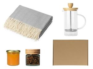 Материал товара: плед - 100% хлопок, чай - банка -стекло, крышка- дерево, френч-пресс - боросиликатное стекло, буковое дерево, нержавеющая сталь 304 марки, коробка - картон