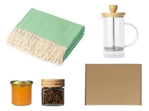 Материал товара: плед - 100% хлопок, чай - банка -стекло, крышка- дерево, френч-пресс - боросиликатное стекло, буковое дерево, нержавеющая сталь 304 марки, коробка - картон