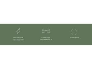 • Совместимо с устройствами, изготовленными по стандарту Qi • Быстрая зарядка. Поддерживает быструю зарядку до 10Вт* При включенном в сеть БЗУ по контуру горит зеленая подсветка, в режиме заряда мобильного телефона подсветка светится синим цветом. *для зарядки в быстром режиме необходимо использовать сетевое USB ЗУ (в комплект не входит), поддерживающее технологию Quick Charge 2.0/3.0