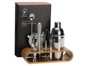 Комплектность: бамбуковая подставка- 27,3 х 10,6 х 6,6 см, барная ложка, джиггер 15/30 мл, гейзер -2 шт, мадлер, штопор, стрейнер, щипцы для льда, шейкер 550 мл
