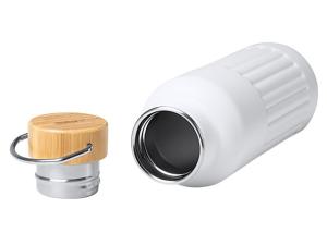 Термобутылка из переработанной нержавеющей стали 304 с двойными стенками и бамбуковой крышкой. Объём: 500 мл. Упакована в экологичную коробку.