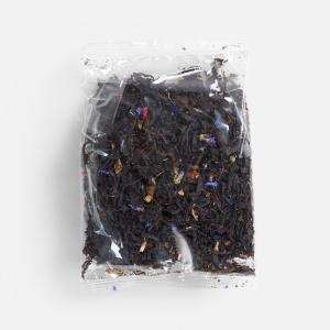 Праздничный купаж на основе черного чая, украшенный цветочными лепестками и кусочками клубники.