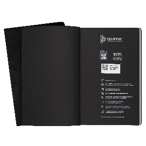 Бизнес-блокнот Bplanner. 05 — абсолютно новая модель в линейке Bplanner. Это бизнес-блокнот с недатированным тонированным блоком в клетку. Блок имеет ряд особенностей: наличие титульного листа с возможностью добавления личных данных и контактной информации, трекер воды и шагов на каждой странице и 3 разворота для заметок в конце блокнота. Обложка изготовлена из экокожи Nubuk-touch и имеет прострочку по краю в цвет материала. Фактура материала напоминает замшу или нубук. У блокнотов цветной форзац и нахзац. На форзаце расположен qr-код, который активирует годовой доступ к мобильному приложению. А приложение способно теперь еще и распознать и оцифровать текстовые заметки.