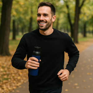 Тактильно приятное софт-тач покрытие обеспечит надежный захват и комфортные ощущения.Крышка с кнопочным механизмом позволит легко открыть бутылку одной рукой.